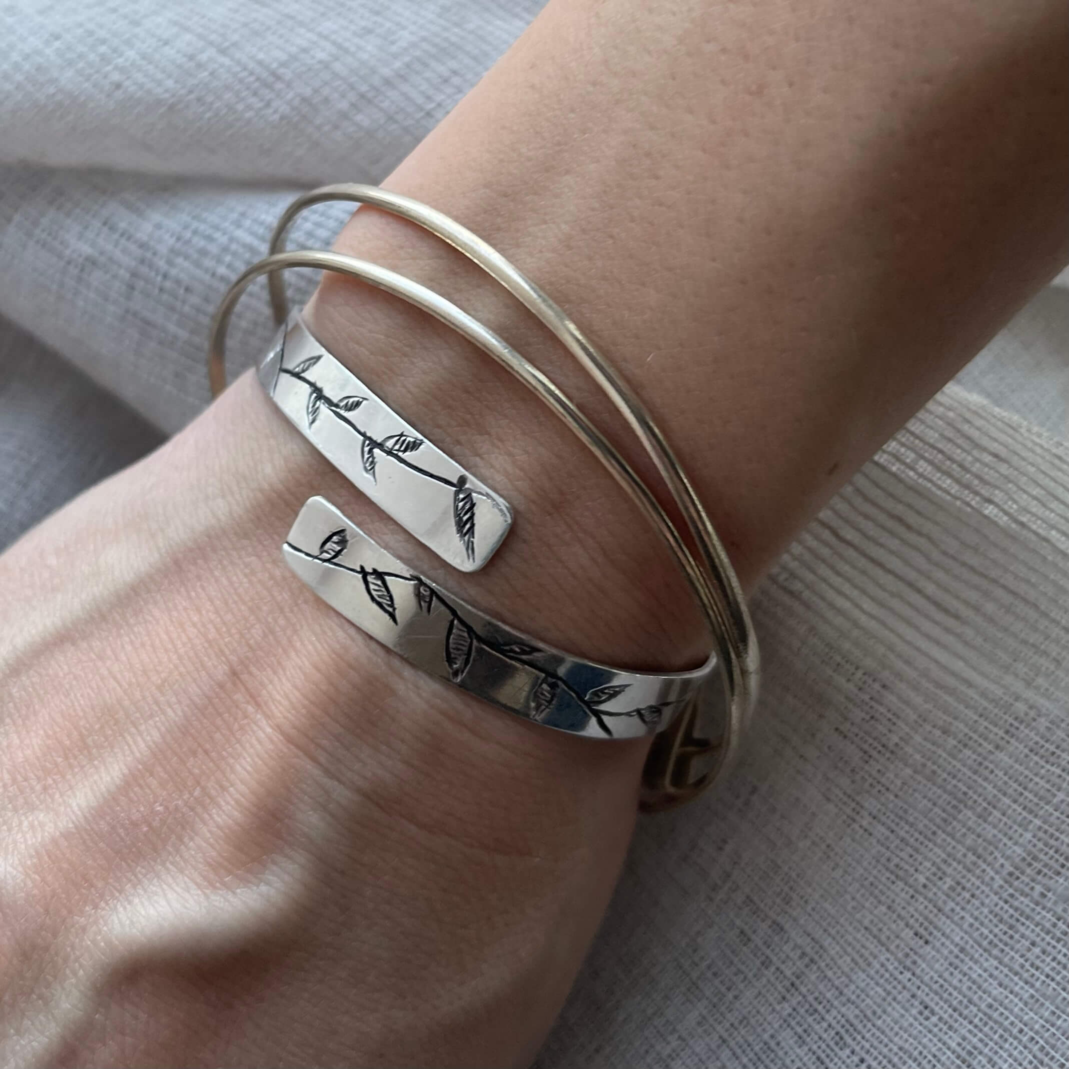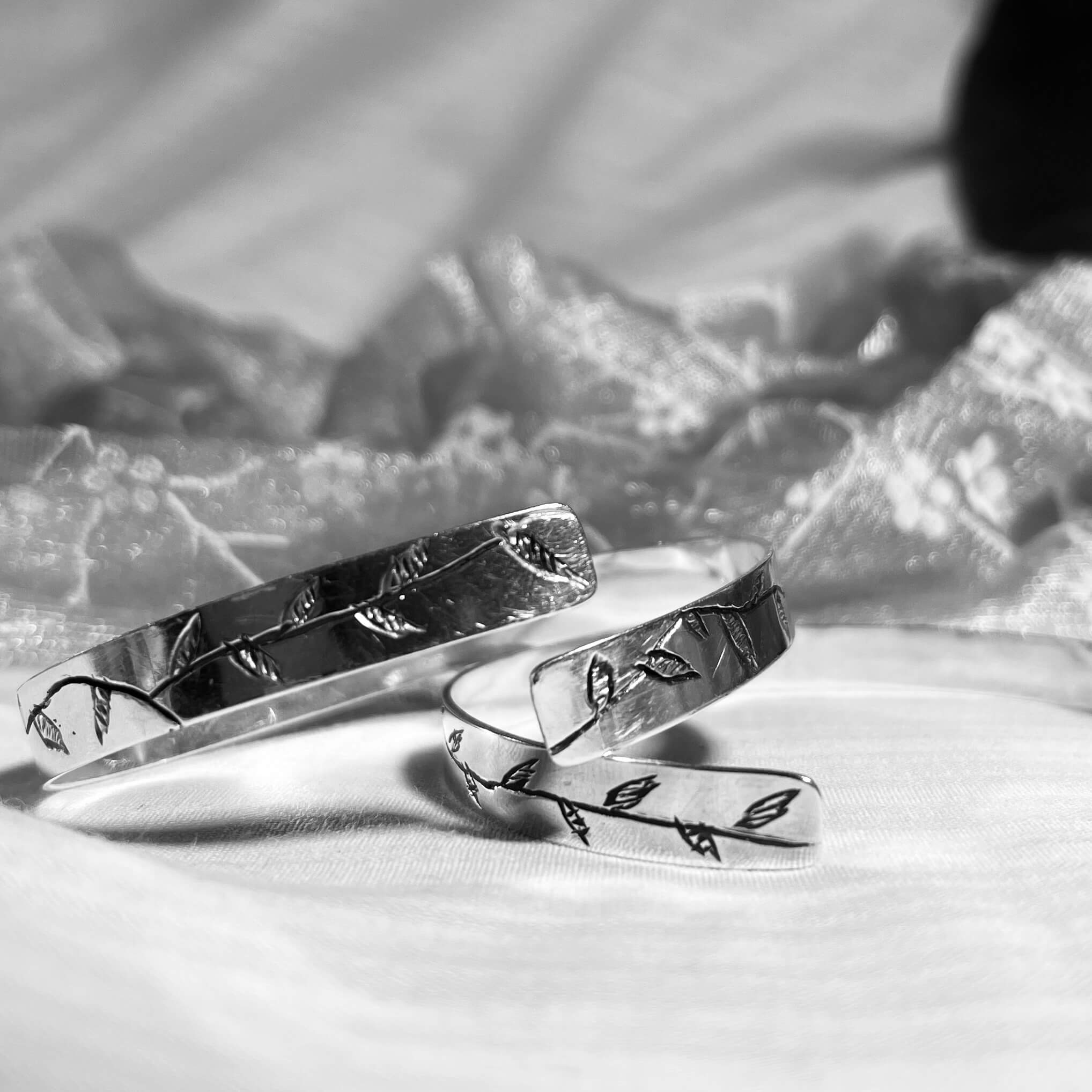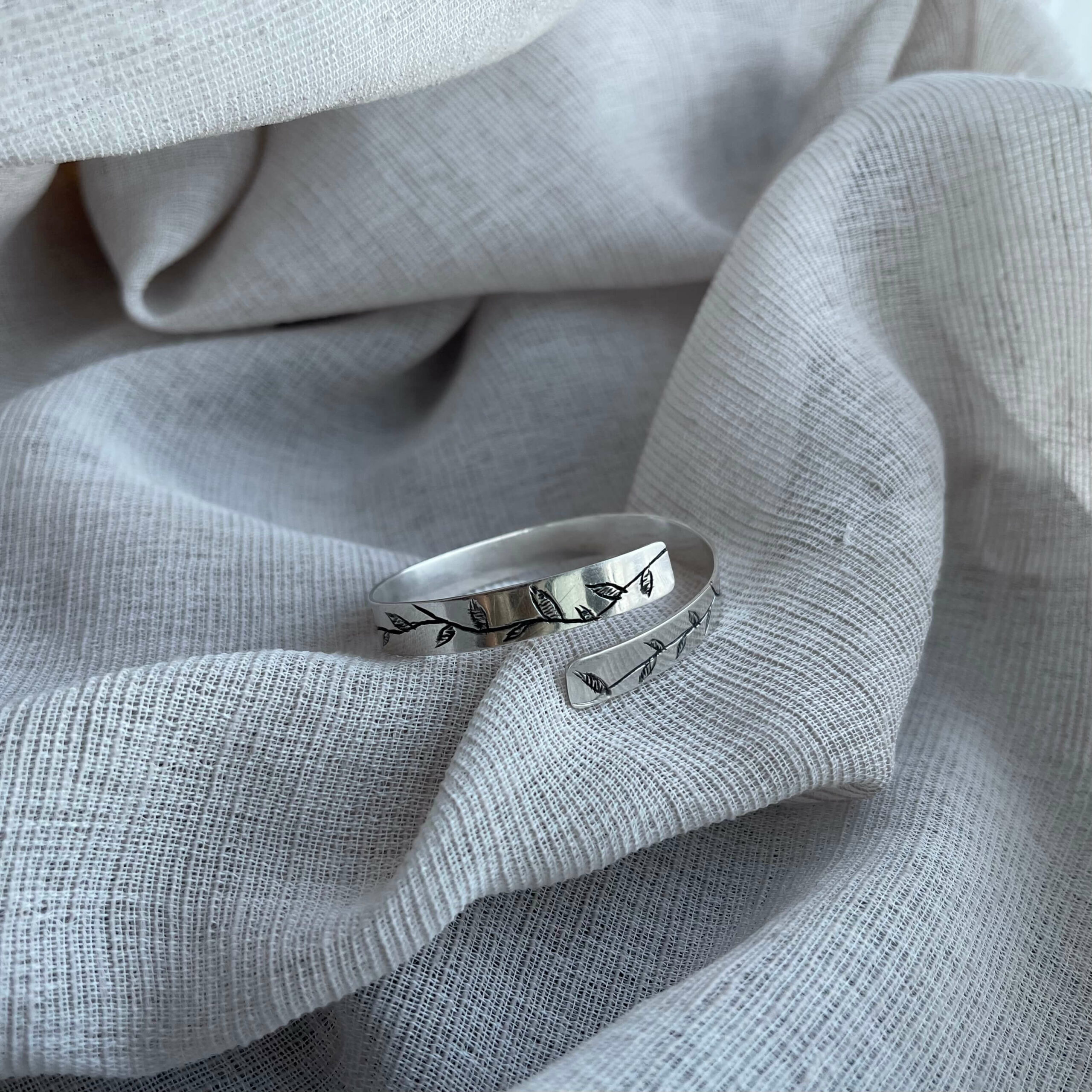 Ένα αρκετά παχύ φύλλο ασημιού σχεδιάζεται σε σχήμα χειροπέδας και σε ελεύθερο σχέδιο χαράσσεται με τέτοιον τρόπο, ώστε να δημιουργήσει μία μοναδική σύνθεση κλαδιού με φύλλα.