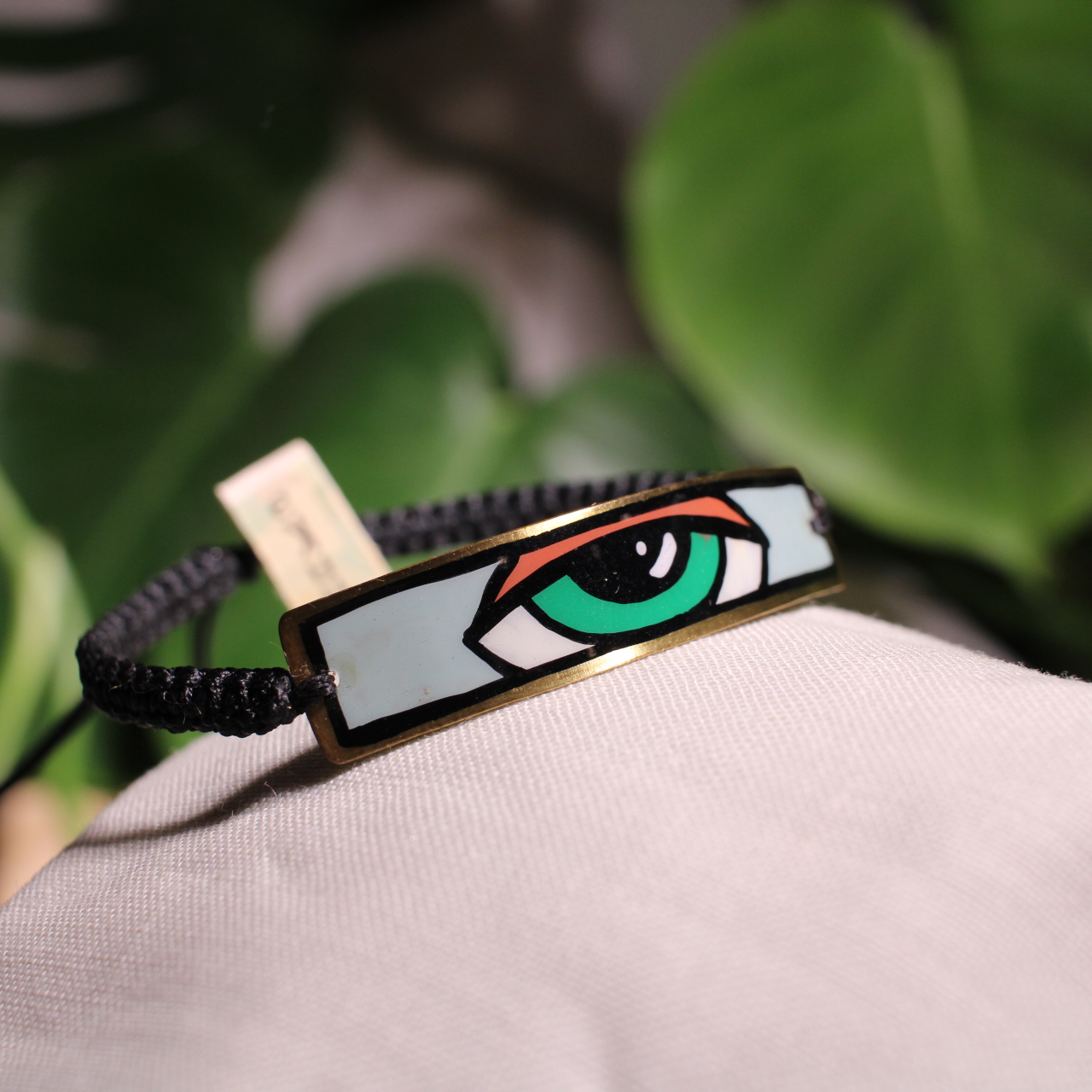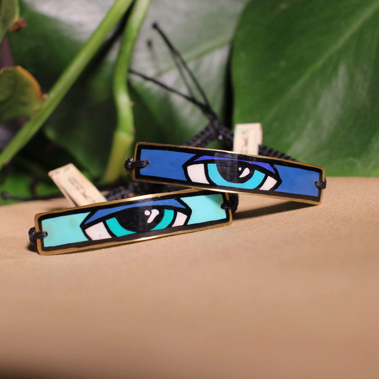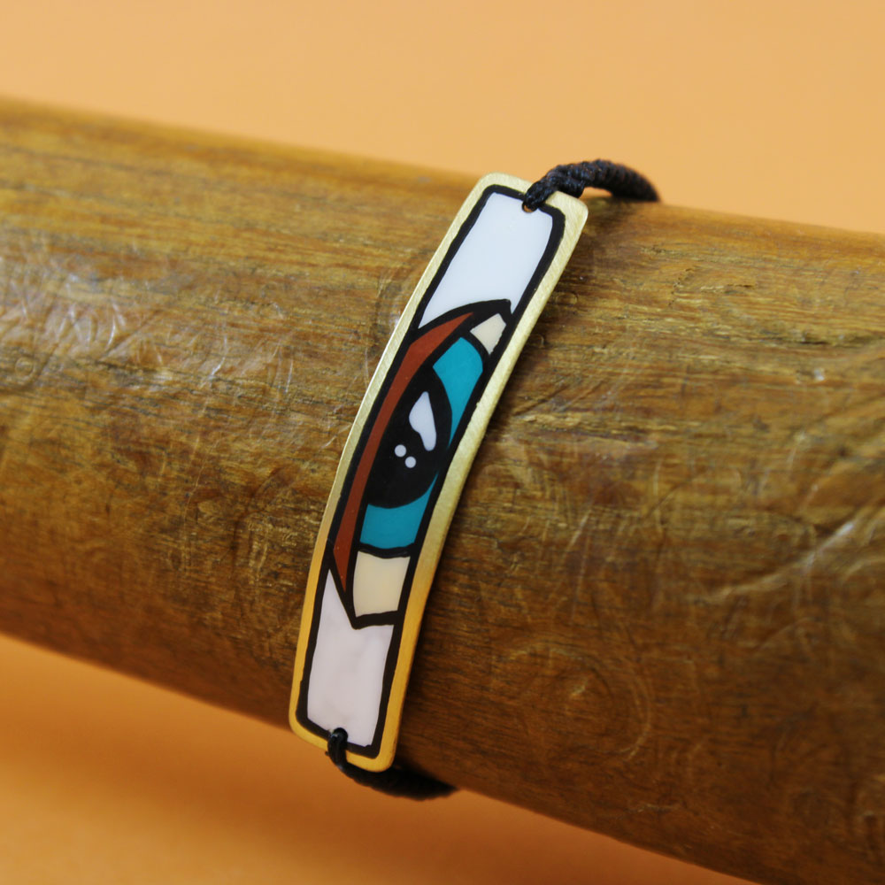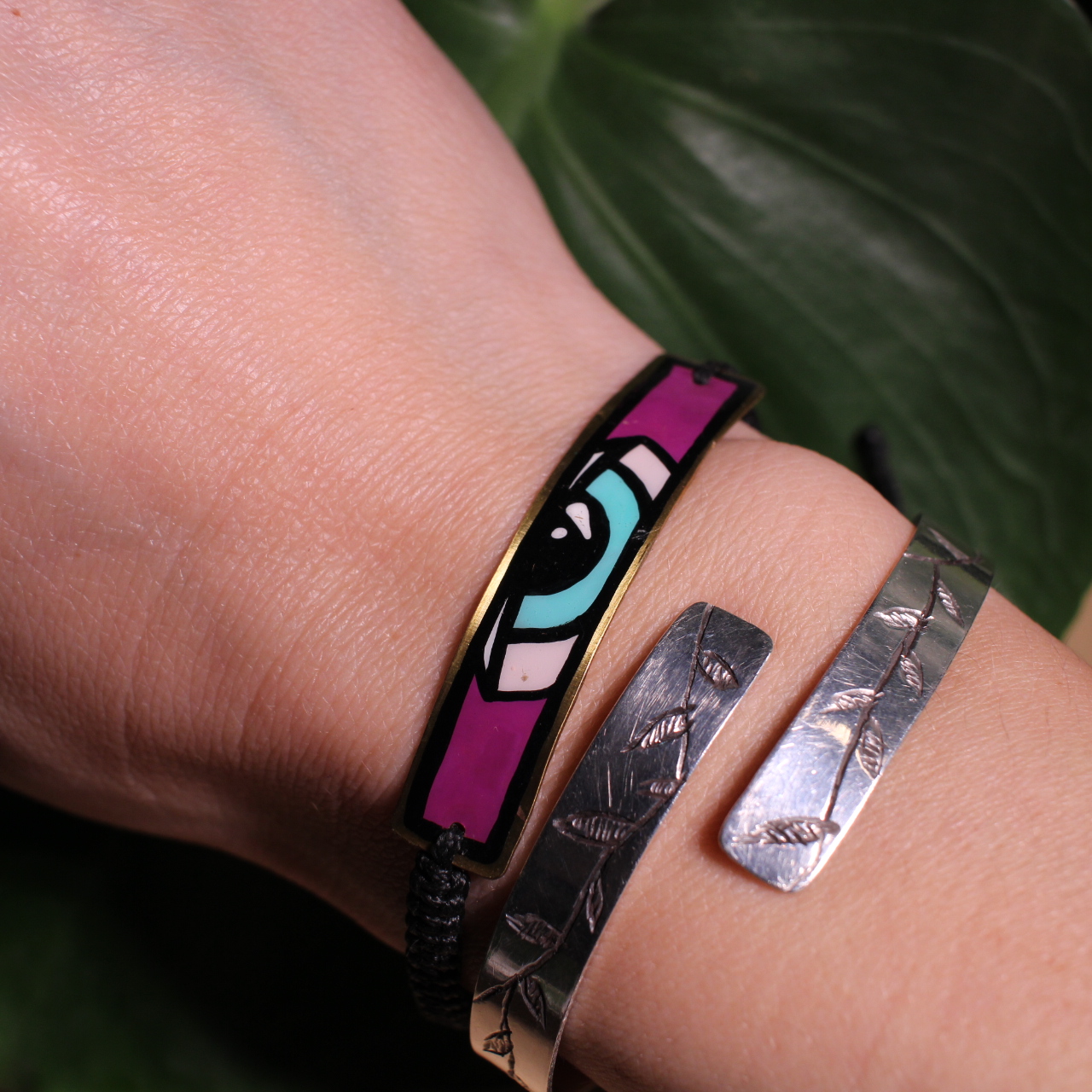 Το χειροποίητο βραχιόλι Ramona, είναι ένα πρωτότυπο ζωγραφισμένο μάτι, σε παραλληλόγραμμο μέταλλο (ορείχαλκος ή ασήμι 925).