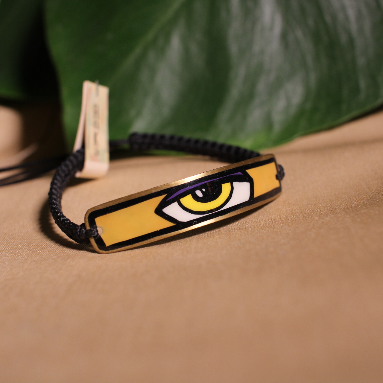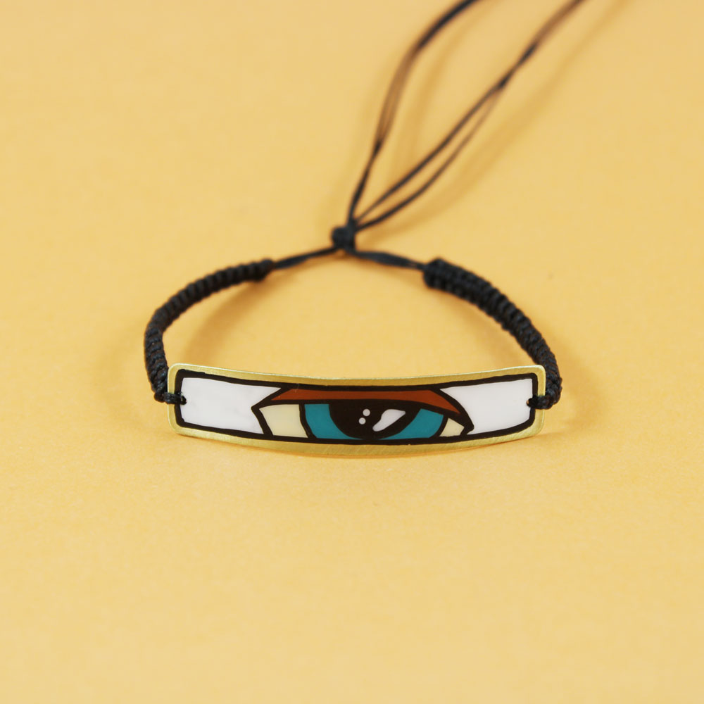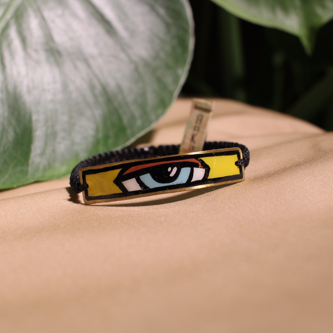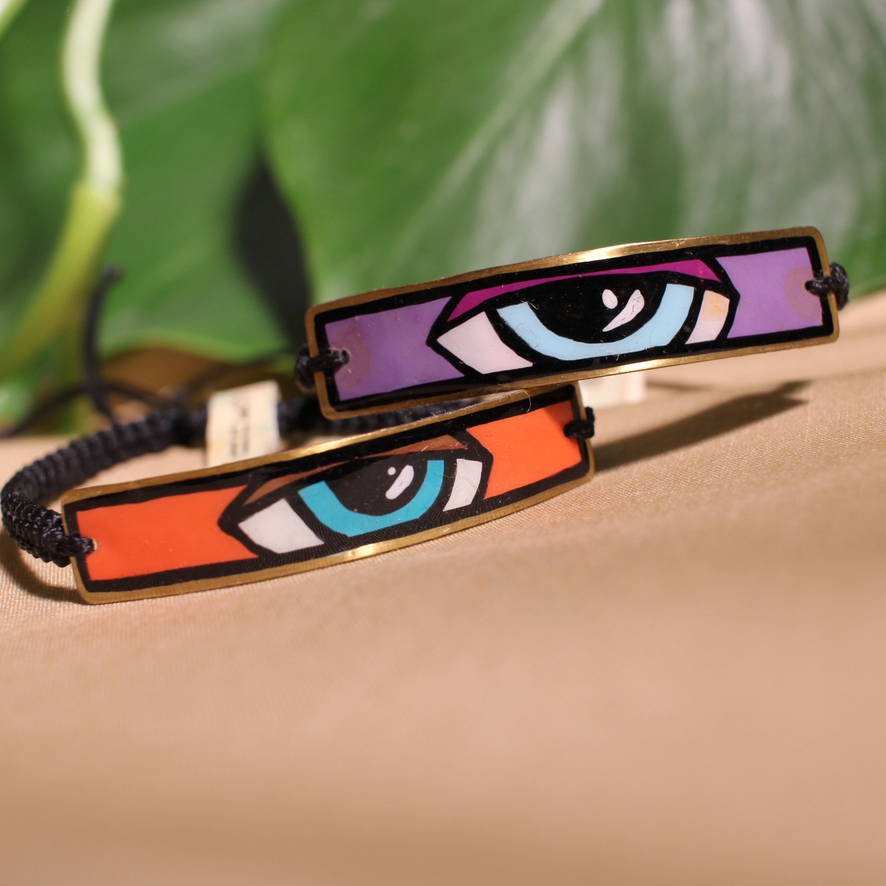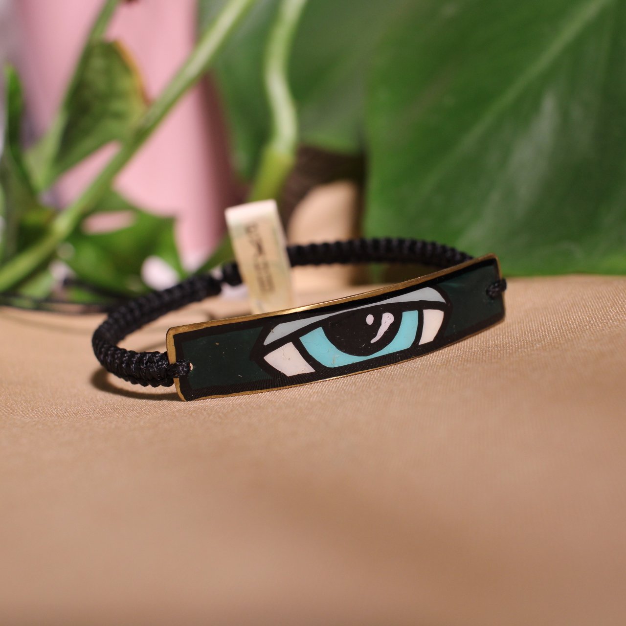 Το χειροποίητο βραχιόλι Ramona, είναι ένα πρωτότυπο ζωγραφισμένο μάτι, σε παραλληλόγραμμο μέταλλο (ορείχαλκος ή ασήμι 925).